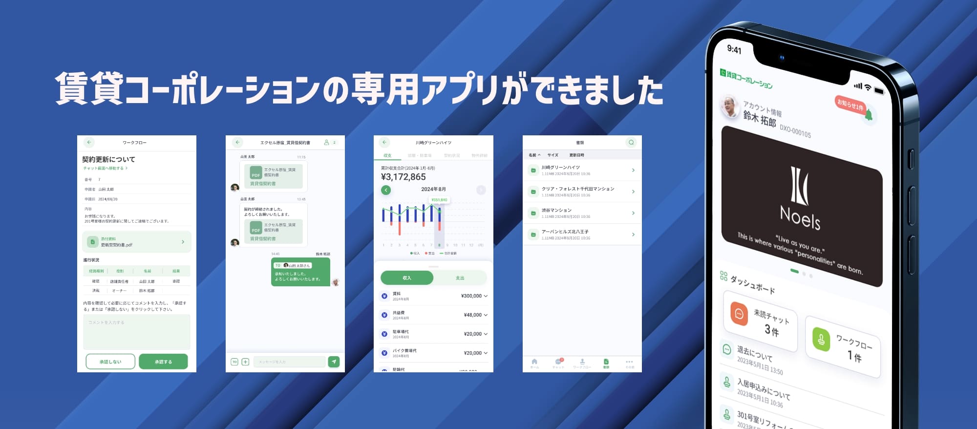 賃貸コーポレーションが提供する専用アプリでは、毎月の収支状況をアプリ上でスピーディーに確認でき、書類やメールを探し直す手間を解消します。管理会社との連絡もチャット形式でスムーズに行えるため、やり取りの漏れやタイムラグが大幅に軽減。さらに、管理会社から送られる書類は自動でアプリ内に保存され、紛失の心配なく管理可能。承認作業もその場で完結できるため、重要な手続きもスムーズに進められます。オーナー様の管理業務を手軽に、効率的にサポートする便利なアプリです。